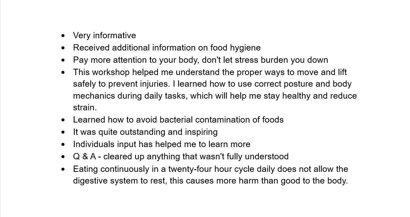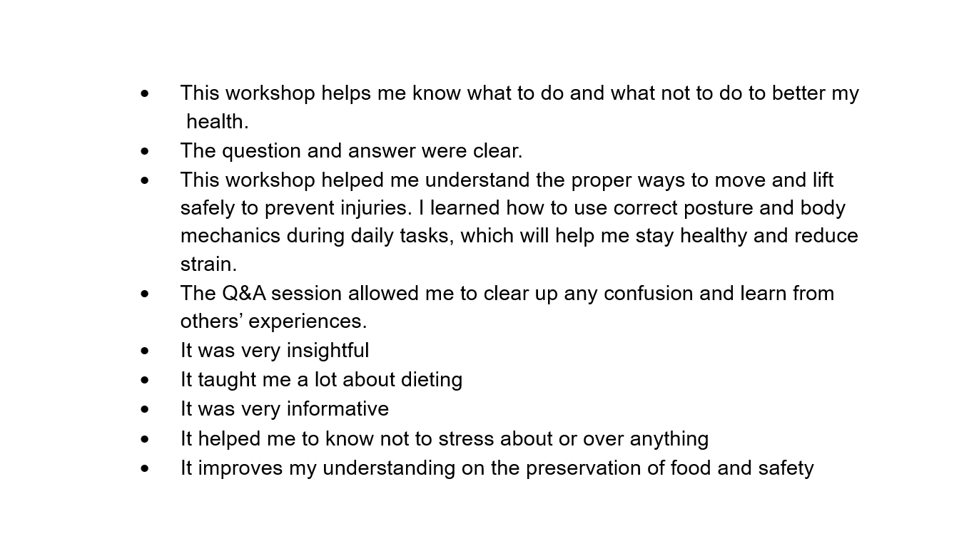 Our second workshop focused on supporting healthy living by preventing injuries and promoting lifelong mobility. ECF’s dynamic workshops offered practical guidance on safe lifting techniques, posture improvement, ergonomic adjustments for various tasks, and strategies to reduce strain during activities and inactivity. Participants were taught how to add positive movement habits into their everyday routines. This workshop assisted with preventing injury and chronic pain by ensuring the body is used in a safe and efficient manner. It improved our attendees’ ability to perform daily activities.
